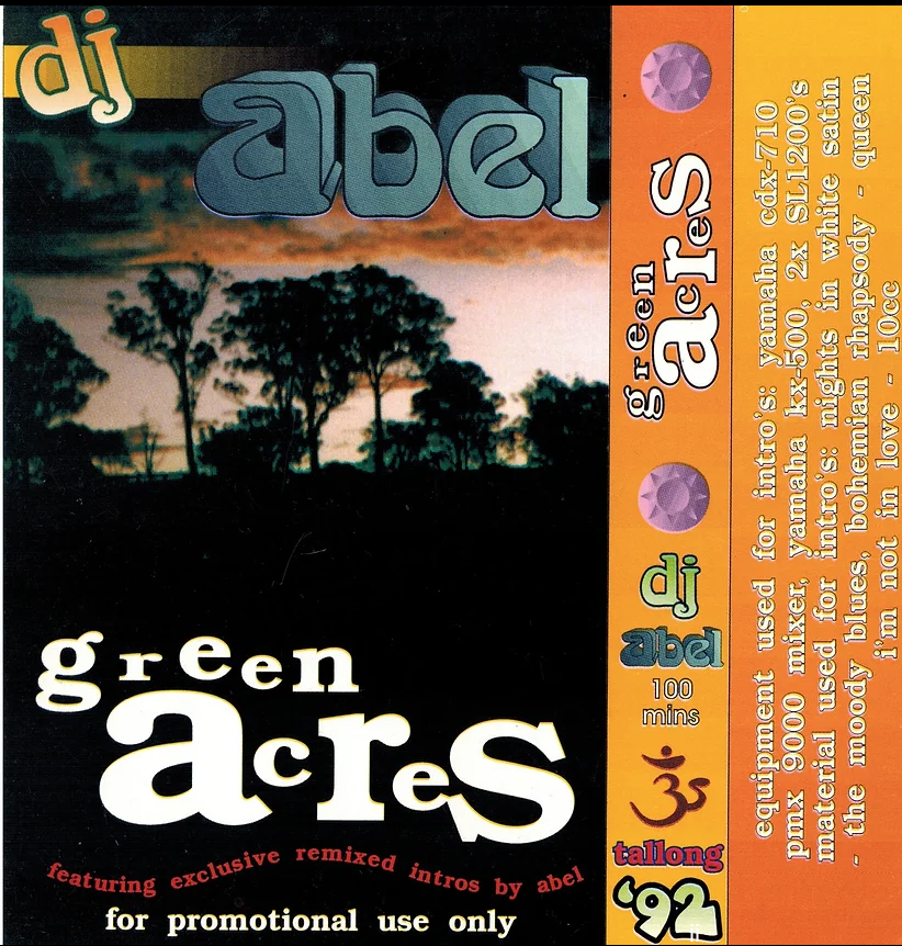 ABEL: Green Acres began as small gatherings in the bush for friends and each event had no more than 50 people at one time. The parties we're so memorable they inspired me to make a mix tape. The first Green Acres mix tape 1991 was recorded on cassette in my parents garage all on vinyl in one take, no computers or editing. Looking back it was ground breaking, I mixed in long intro's by 70s rock band The Moody Blues.